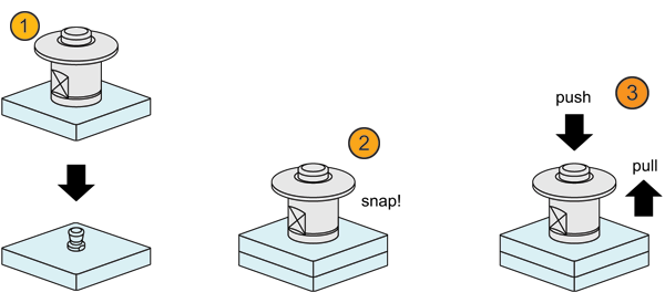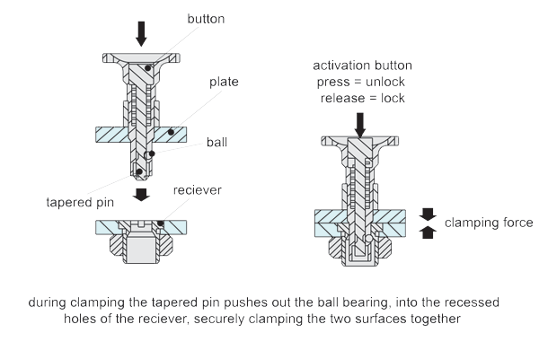 Ball Locking One-Touch Fasteners operate through a simple push button that releases the ball locks at the bottom of the fastener when actuated, releasing the component it has been fixed to. This makes them especially useful for machine covers or removable panels where you require ease of access.