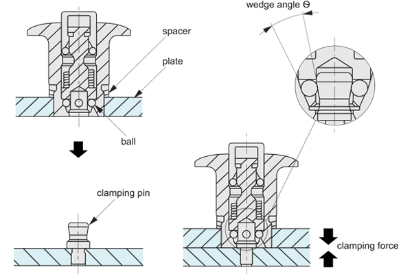 Four ball bearings clamp onto the clamping pin (33923), the wedge shape of the pin draws the panels together during clamping.