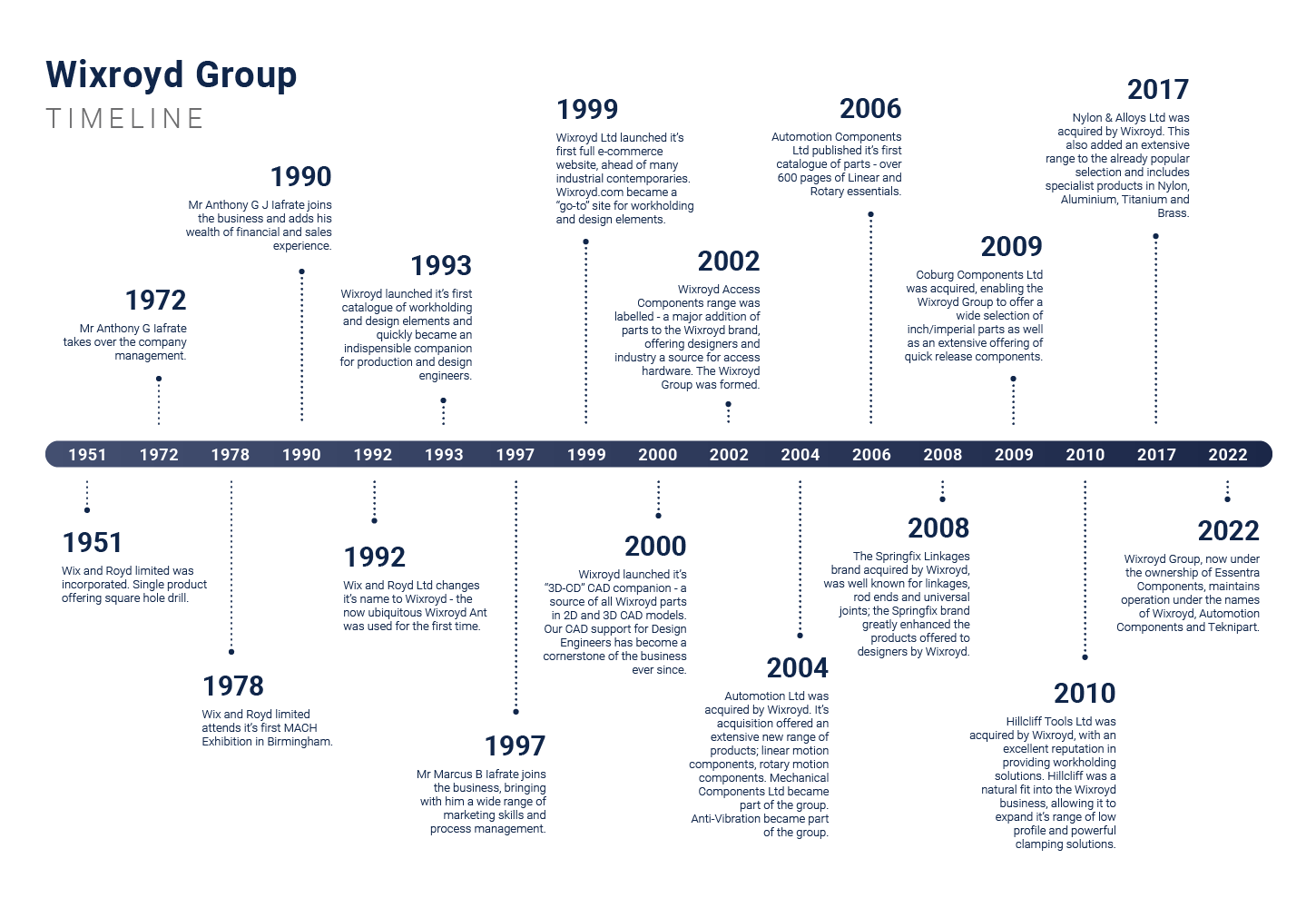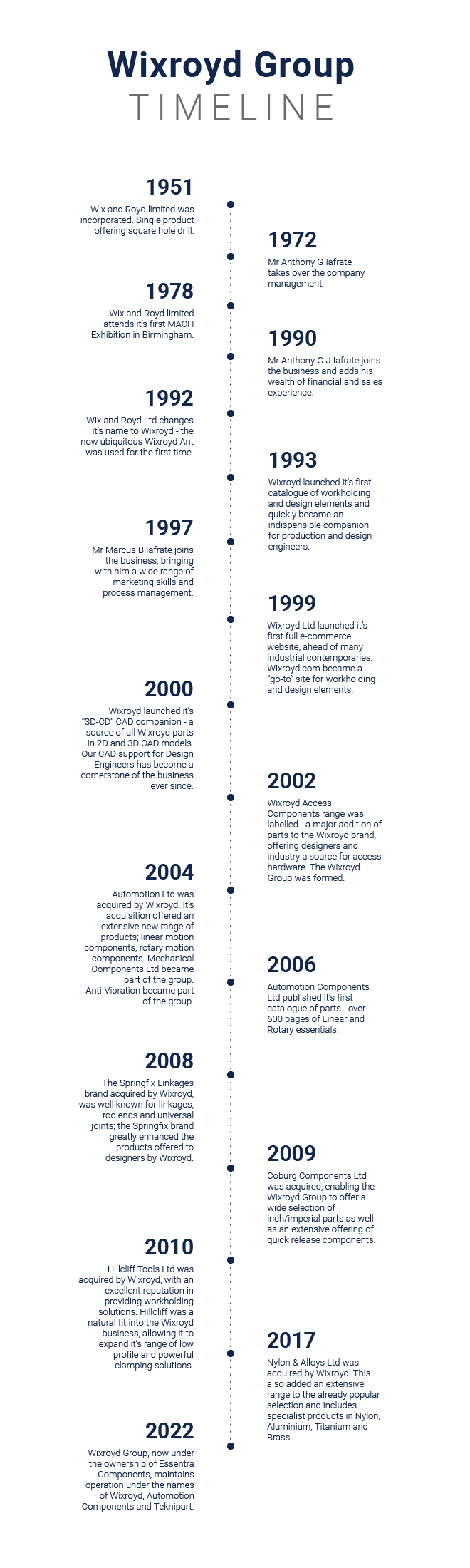 Incorporated in June 1951, operating from its original Trafalgar Square office and single product offering of a square hole drill, Wixroyd, through sales growth and acquisition became the go-to supplier for product designers. Having been acquired by Essentra Components in 2022, Wixroyd Group continues to operate under the brands of Wixroyd, Automotion Components and Teknipart.