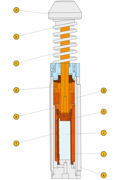 1) Shock Absorber at rest, piston rod A, fully extended through force exerted on it by return spring B.