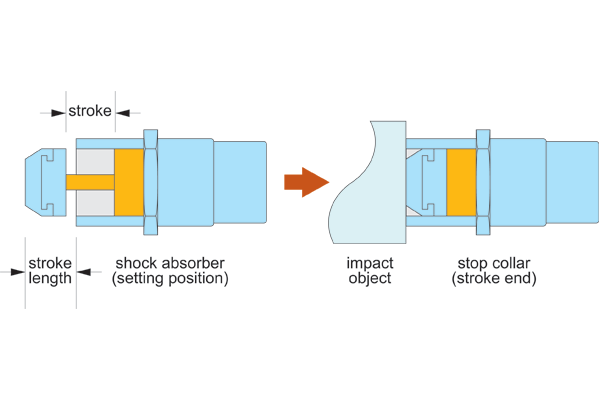 We advise the use of external mechanical stops with all of our Shock Absorbers, typically within 1 to 0.5 mm from the end of the stroke. Alternatively, we have a range of stop collars available, which can be mounted directly to the Shock Absorber body (see our part 68030). Stop collars are available for our M8 to M36 threaded models, they can be used both to adjust stroke and also to fix the end position of the load.
