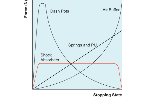 Shock Absorbers Designed to stop a moving object smoothly and quietly from beginning to end of its impact stoke. Their design enables constant resistance force or linear deceleration throughout impact stroke, they quickly convert kinetic energy of a moving object into heat which is quickly dissipated into air.