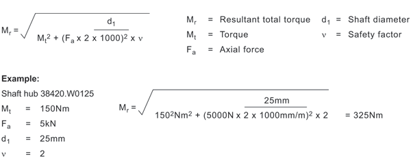 If torque (Mt) and axial forces (Fa) are transmitted simultaneously, a resultant total torque (Mr) is obtained which must be less than or equal to the maximum torque (Mmax) indicated in the charts. (Mr ≤ Mmax)