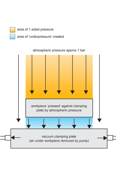 The net result is a one-sided pressure on the top surface of the workpiece, the strength of this one-sided pressure is dependent upon the size of the vacuum generated - generally this is 0,7 to 0,8 bar. This means that a vacuum of 200mbar (absolute pressure) is generated, and hence the pressure differential acting on the workpieces is 800mbar (approx. 0,8kp/cm). Size of the clamping force is then only dependent on the clamping area.