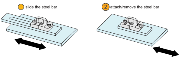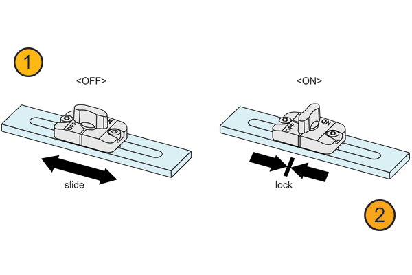 The Sliding Clamp is mounted in a fixed position in an assembly. When set to its off position, a sliding bar can be moved left or right as two spring loaded ball plungers provide free movement of bar. Once in its desired position the sliding bar can be locked in place, through a 90° turn of the sliding clamp handle to engage clamping shaft. This makes Sliding Clamp One-Touch Fasteners ideal for processes that require quick positioning, locking, releasing and re-positioning of sliding bars. When additionally used with a scale plate, the reading line on the sliding clamp enables quick and accurate alignment.