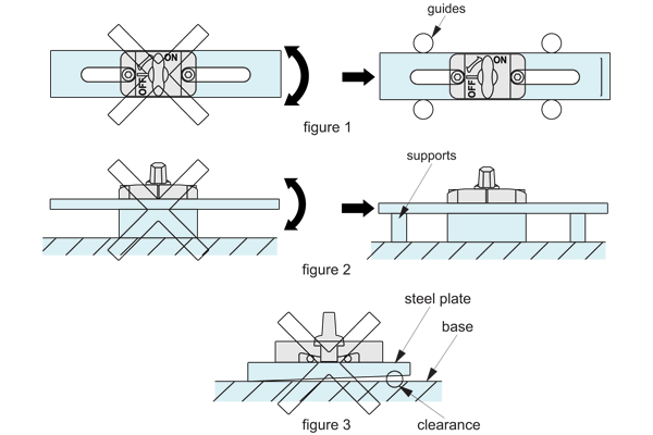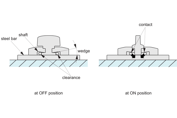 The steel bar is locked when the knob is at the "ON" position since the shafts are pushed by the wedge.