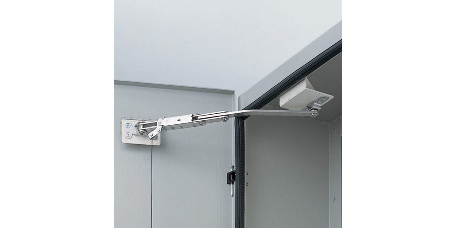 Mechanically locks door at fully open position. Slide the locking lever to release stay. Lever will remain in unlocked position until the door is returned to fully open position.