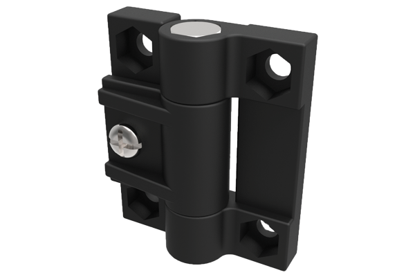 Made from polyamide, black finish. Opening angle 160°. Hinge torque adjusted by screw. Provides position control. Supplied with fixing nuts and bolts.
