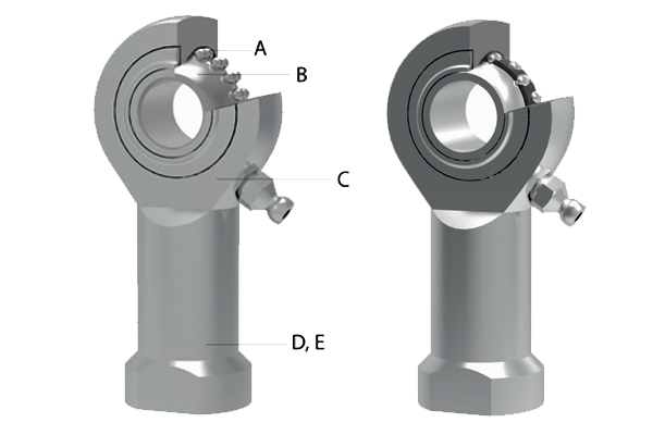 This design is especially suitable for high speeds, large swivelling angles or rotating movements with relatively low or medium loads. Prominent technical features are the low bearing friction, long-time greasing as well as the sealing against some dirt penetration (by means of shields on both sides). Under normal operating conditions, the Rod Ends are maintenance-free. Greasing nipples are provided for lubrication, in case of rough operations and maximum loads. To avoid incompatibility with the production lubrication, we recommend lubrication with a calcium-complex-soap-grease. A special heat treatment procedure gives the Rod End housing a raceway hardness, adapted to the anti-friction bearing, ensuring at the same time high stability with changing loads.