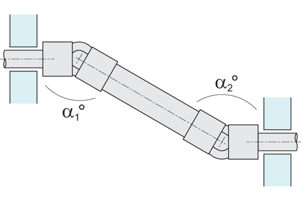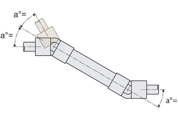 The difference between the maximum and the minimum speed of the driven shaft depends on the angle formed by the two shafts. The difference grows with an increase of the angle a°. To have homokinetic transmission, either two opposite single joints (ensuring that the two central yokes lie on the same plane and the angles are equal) or double joints need to be fitted. The irregularity caused by the former articulation is cancelled by the latter. The overall length resulting from the coupling of the two single joints can be reduced by using a double joint. In other words, the double joint is to be considered as the shortest homokinetic transmission.