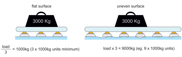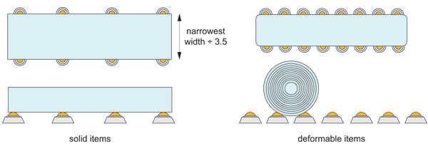 How the Ball Transfer Units should be arranged depends on the bottom surface of the load to be transported. For loads with a uniform, even bottom surface, e.g. packing cases, the distance between the Ball Transfer Units is calculated by dividing the smallest dimension by 3,5.