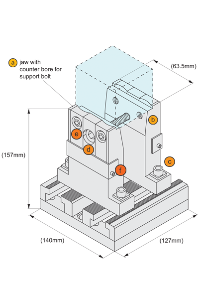1. Mount unit to faceplate/sub-plate using M12 SHCS. Note: Gripping Jaws can be adjusted to workpiece size by simply loosening jaw bolts c with support bolt b removed. Serrated rails have inch and metric indicators, which align with inboard face of jaws.