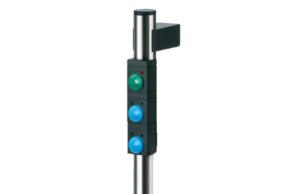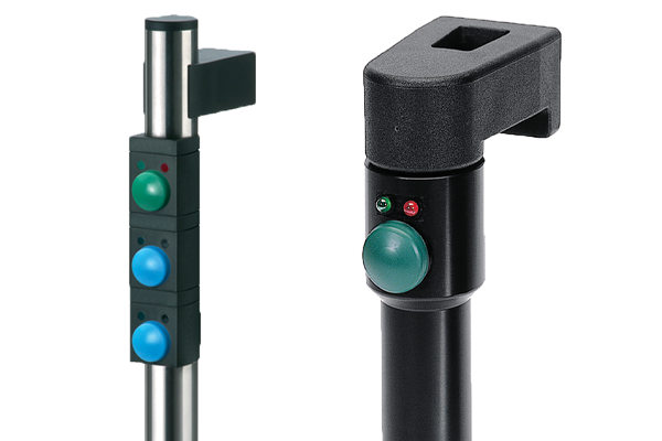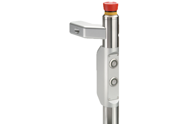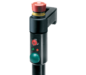 Functional handle with inbuilt emergency stop with 2 NC and 1 NO contacts for PLC systems.