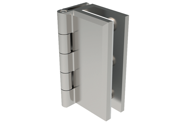 To hinge glass-to-glass, use these particular hinges as they provide non-flush hanging of glass to glass. Requires mounting holes to be cut into the glass.
