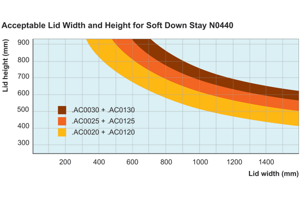 Important notes: For use with relatively light weight cabinet or furniture lids. Improper application, or use on a lid not within recommended size and bearing value, may lead to stay being overcome and slamming of lid. Application must be within both the minimum and maximum load bearing value of the stay, (see product table for load bearing capacity when using stays as single or in pairs), as well as within the door weight capacity of the stay; See ‘Soft Down Stays - Door Weight Range Tables’ on previous pages.