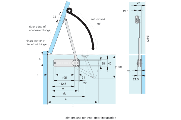 The distance for a, b, c (as shown in the installation diagram above) is measured from the “door edge (*)” to the “top surface of bottom board” when drop hinges are used and from “hinge centre (**)” to "the surface of the bottom board” when piano or butt hinges are used.