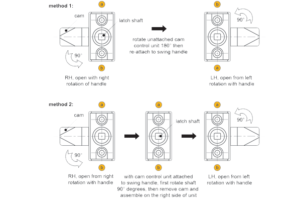 This method can be used with the cam control elements already attached to the Swing Handle body. Firstly rotate the cam 90°, the cam control shaft will also rotate 90°. Secondly, remove the cam and re-attach on the right hand side.