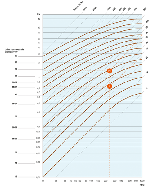 Important Note: Diagrams' values are merely indicative and refer to the single joints only. When choosing a double joint, you have to consider that they can transmit a torque about 10% lower than the same sized single joints. Each application has its own particular motion characteristics, such as: shock loads, motion reversals, connected masses, kind of starting presence of elastic joints, stops and starts, etc..., that have to be considered when choosing the joint.