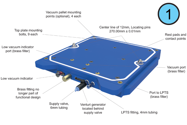 Important Note: One loose top plate bolt may interfere with pallets precisely locating on rest pads, preventing 100% vacuum.