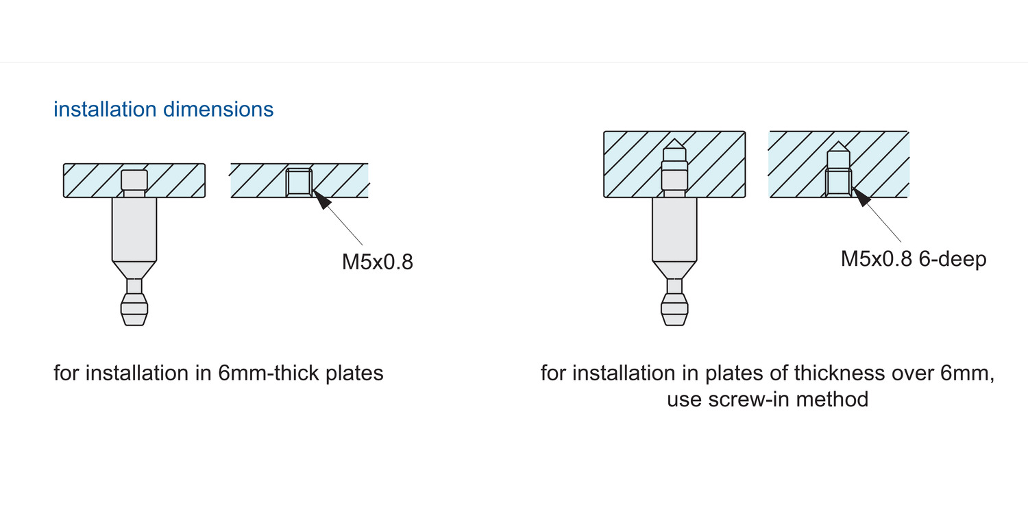 Pin 33930 is for use inconjunction with one-touch fasteners, ball clamping; 33934 and 33936. Suitable for panels/enclosures of 6 to 20 mm thickness. Requires an M 6 thread, 6mm deep for installation into blind hole. See technical pages for further information.