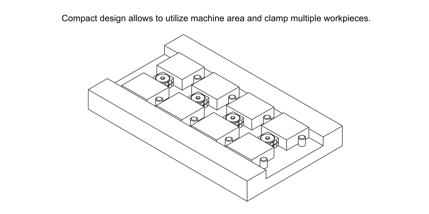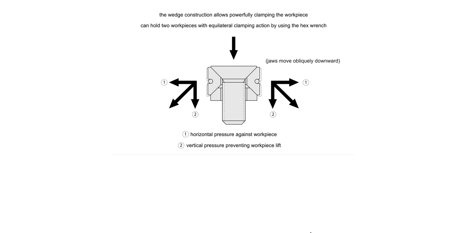 Compact design for clamping of multiple workpieces. Wedge construction results in powerful clamping and holding of two workpieces with equal clamping force.
